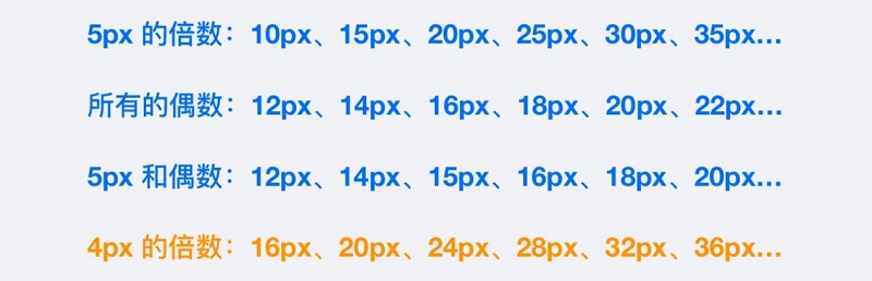 我们以下图 4 组数列为例,大家可能都曾使用过上面三组蓝色数列中的数值应用到设计中,或以 5 为倍数,或以 10 为倍数、或以偶数为设计逻辑,而实际上以 5 为倍数则会包含奇数,奇数会导致控件文字对不齐,当 5 的倍数和偶数同时使用时,则会出现类似 14、15、16 这种相差为 1 的相邻数,这样会导致我们的尺寸规范不好定义规则,难以形成逻辑,而使用 4 的倍数,他们的公差为 4,不会出现奇数,也不会出现相邻数。