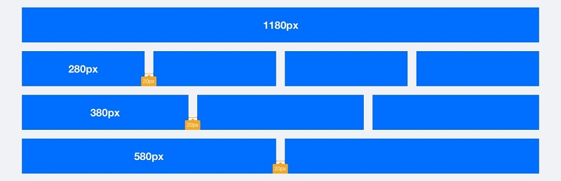 常见的网页栅格及其所均分的卡片和间距,也都是 4 的倍数,如果我们的控件尺寸,图标尺寸和间距都使用 4 的倍数来定义,那所有的信息模块自然都能更好的相互适应,层层递进的逻辑关系也会更加明显。