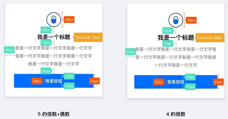 我们把 4 点栅格的设计逻辑套用到卡片设计上,第一眼我们可能比较难去评判两者的好坏,但仔细看,我们就会发现第一个卡片的按钮没有水平对齐,相互之间的间距尺寸也是没什么逻辑性。假如今天调整一个 8px 的间距,明天调一个 10px 的间距,设计师走查起来也很难发现有问题,对接的开发也难以有一个可以参考的规范标准。而相对的,以 4 为倍数,我们会发现所有的信息都会完美对齐,而且倍数为 4 的每个数值之间公差为 4,即使设计稿微调了 1px 我们都能很快发现,开发在还原设计稿时也会有一个衡量标准。