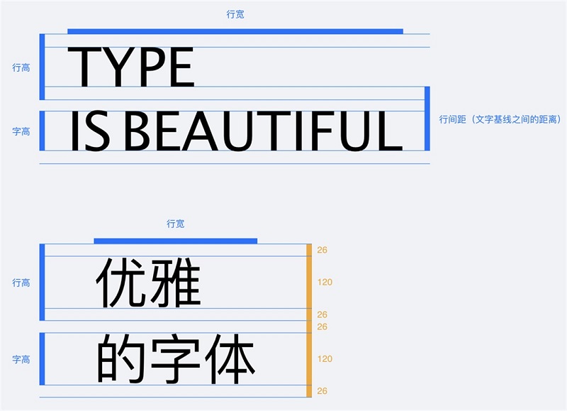 但无论是中文还是西文,我们经常需要用到的无非是字体大小、字重、字色,还有就是经常被我们忽视的行高和行宽,我们从西文字体提取三个最主要的因素,即字高、行高、行宽。基于西文字体的结构转换为中文,我们可以理解为,字高指的就是我们肉眼所能看到的字体的实际高度,而行高指的是字高+上边距+下边距,反过来说,行高减去字高除以 2 就能得到我们的上下边距,行宽指的就是整个文本的宽度。