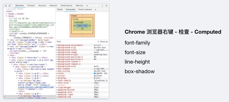 走查还原的时候,在 Chrome 浏览器的空白处右键点击检查,找到里面的 Computed 窗口,我们可以找到具体的文字、间距、投影等属性,有时候一些比较细微的调整,我们可以双击具体的数值进行调整,调整到自己满意之后再把具体的数值给到开发,这样就不用在我们摇摆不定的情况下,造成双方的困扰。