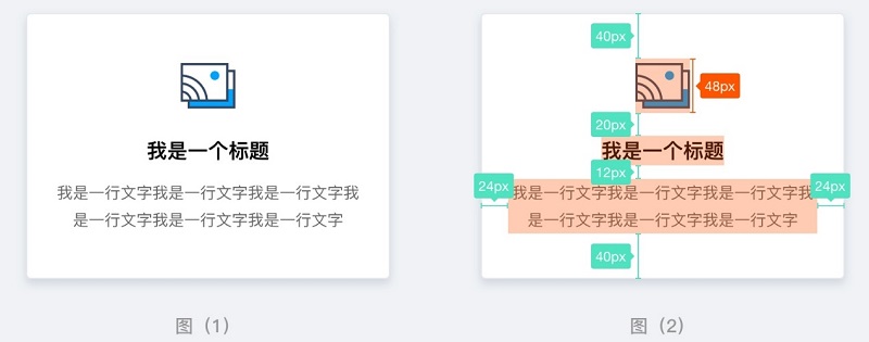 举一个图文模块的例子,图(1)中我们肉眼所看到间距,在我们做标注时,看到的其实是图(2)中的三个色块,我们实际给到开发的标注,是色块的尺寸和色块之间的间距,以及详细的文本属性。