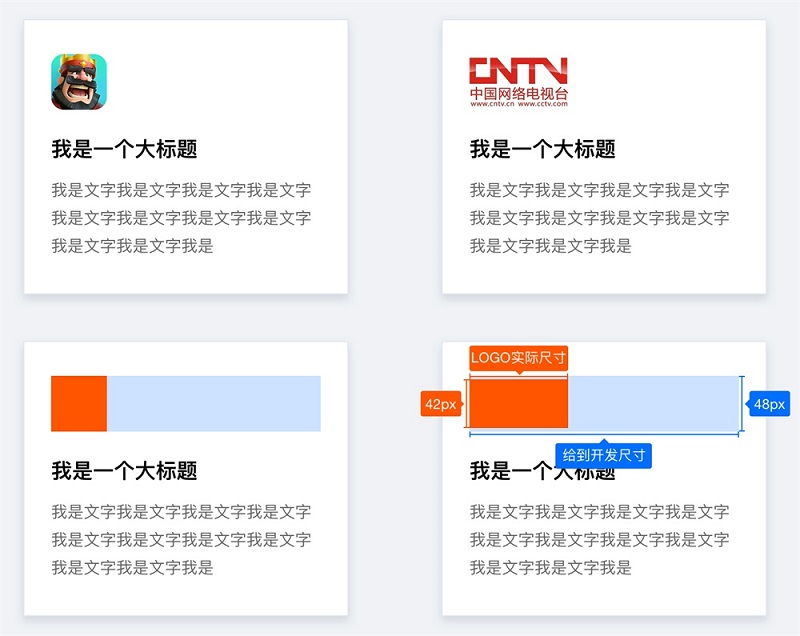 以客户案例的卡片样式为例,客户案例在 to B 产品中是必不可少的模块,我们的客户 logo 有的圆形,有的长方形,有的纯文字,尺寸差距比较悬殊,这种情况下我们需要给他限制一个高度,在这个高度以内,再根据 logo 本身的体量来调整图形的大小,处理好 logo 的视觉平衡,最后红色区域是 logo 的实际尺寸,蓝色区域则是我们实际给到开发的尺寸,从开发的角度来看其实就是占位符,而规范的作图则是把占位符的透明度调整为 0,以占位符为实际有效作图区。