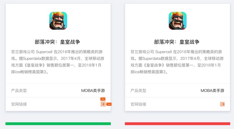 UI 设计中通常以「向右箭头」来表示当前链接可跳转,使用箭头作图时,当我们把箭头和文字右对齐,箭头其实会更加的往外突出,这时候我们会人为的往里边推 1 至 2 像素,最后实际给到开发的也应该是红框的尺寸,也就是 16×16 的占位图尺寸。