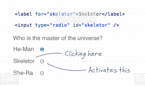 使用“for”属性允许用户点击标签,就可以选择到表单中整个的输入区域,这对单选框和复选框扩大点击区域十分重要。但要注意选择内容的匹配。