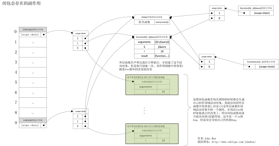 上面的代码先通过匿名函数表达式开辟了一块私有作用域,这个匿名函数就是我们上面所说的外层函数,该外层函数有一个参数$,同时还定义了变量result和 I , 通过for循环给数组result赋值一个匿名函数,这个匿名函数就是闭包,他访问了外层函数的变量I , 理论上数组result() 会返回相应的数组下标值,实际情况却不如所愿。