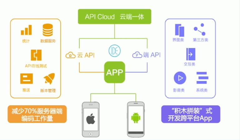 APICloud是一款“云端一体”的移动开发平台,信仰“云端一体”的理念,重新定义了移动应用开发。APICloud为开发者从“云”和“端”两个方向提供API,简化移动应用开发技术,让移动应用的开发周期从一个月缩短到7天。APICloud由“云API”和“端API”两部分组成,可以帮助开发者快速实现移动应用的开发、测试、发布、管理和运营的全生命周期管理。