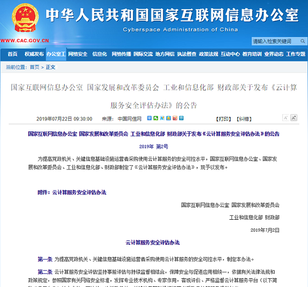 今日,国家互联网信息办公室等 4 部门制定并发布了《云计算服务安全评估办法》,本办法自 2019 年 9 月 1 日起施行。