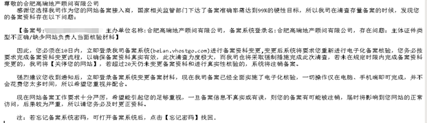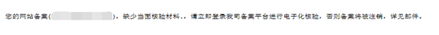 当您收到我司任一核查通知时,您需根据提示在整改期内对备案信息进行整改。如果您未在整改期内完成修改,您的备案可能会被我司取消接入或被管局注销,从而导致您的网站业务受影响。