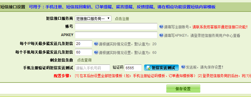在后台设置好短信接口,即可以拥有手机短信注册、订单短信通知、留言短信通知、手机短信找回密码、反馈短信通知等