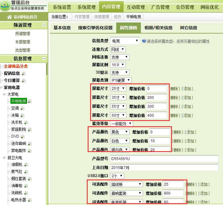 添加产品时,在属性规格栏目里可以让不同的属性设置不同的价格