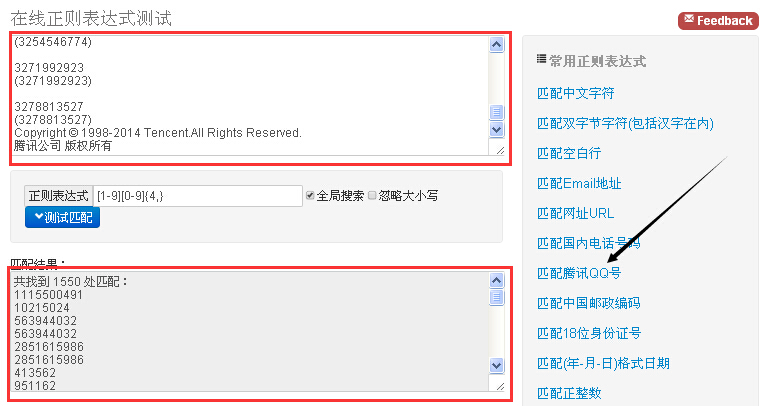 3,然后ctrl+A全选,并复制,然后粘贴到“在线正则表达式测试”中,再点击下“匹配腾讯QQ号”,如下图